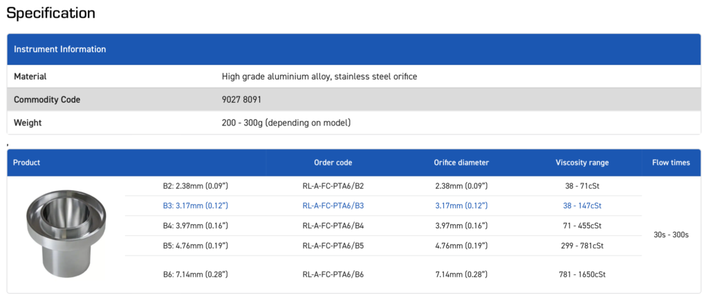 Manufactured from high grade aluminium alloy with stainless steel orifices (where indicated), the Rhopoint Flow Cups are available with a range of UKAS / ISO 17025 certified standard oils to confirm the flow cup is measuring within specification.