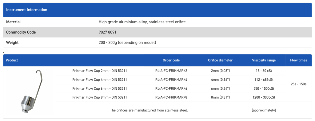 Manufactured from high grade aluminium alloy with stainless steel orifices (where indicated), the Rhopoint Flow Cups are available with a range of UKAS / ISO 17025 certified standard oils to confirm the flow cup is measuring within specification.