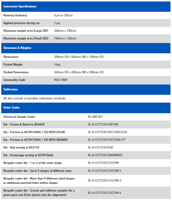 The Hanatek Universal Sample Cutter has been designed for the simple cutting of samples for the packaging laboratory.