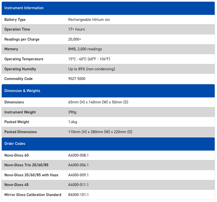 The Novo-Gloss 60° glossmeter is suitable for measuring gloss in most applications from matt to high gloss finishes.