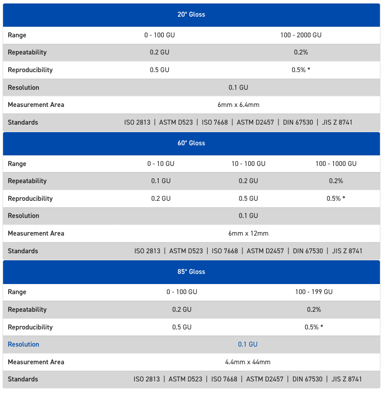 - Calibrate to any standard (from low gloss to mirror finish)