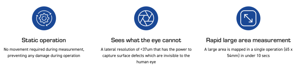 Powerful on-screen functionality includes cross-sectional viewing allowing detection and characterisation of common surface irregularities including defects and waviness.