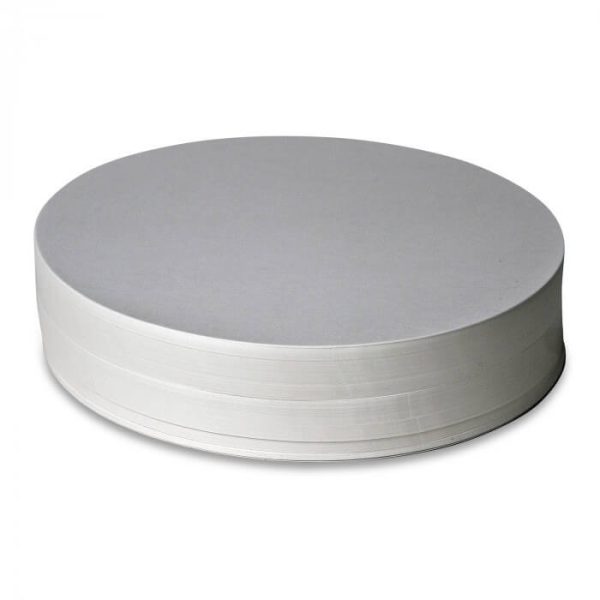 Carrier boards are circular sheets of bleached lined folding boxboard, without colorants or fluorescent whitening agents, having a diameter of 240 mm, a grammage of 200 g/m², and a well-sized surface. The paper cover sheets are circular sheets of well-sized calendered paper, with a grammage of 65 g/m² and a diameter of 205 mm.