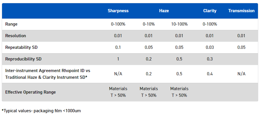 Inter-instrument Clarity agreement between Rhopoint ID and traditional sphere instruments for commercial plastic films (<1000μm) is typically <0.4% C (SD).